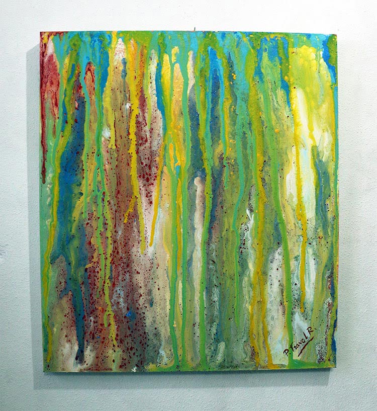 Cascada amarilla forma parte de la colección I. Las obras están realizadas con pintura acrílica como técnica principal. En ellas, busco la experimentación con el color y sus posibilidades expresivas. Una característica particular de esta obra es el uso de un soporte de madera DM reciclada. No solo he trabajado con el color y la forma, sino que también he intervenido el soporte: lijándolo, pegándolo y clavándolo para adaptarlo a la composición. Me gusta trabajar con este material por su calidez, el tacto agradable que ofrece y, además, por el peso del soporte, que aporta solidez y refuerza la sensación de robustez en la obra.