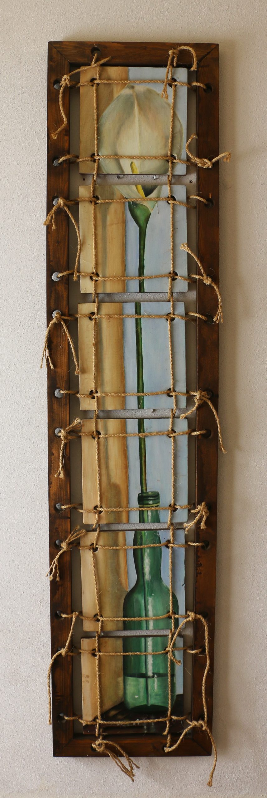 La soga no es un adorno, sino un símbolo: una herramienta práctica, sencilla, que unía y sostenía en la vida de antes. Aquí vuelve a cumplir ese rol, conectando materiales y sentidos. Finalmente, aplico la técnica de pintura al óleo, que me permite trabajar con capas, profundidad y detalle, reforzando el contraste entre lo rústico de los soportes y la carga simbólica de la imagen.