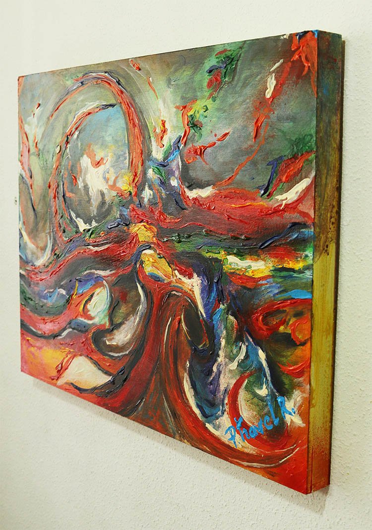Origen, forma parte de la colección I. Las obras están realizadas con pintura acrílica como técnica principal. En ellas, busco la experimentación con el color y sus posibilidades expresivas. Una característica particular de esta obra es el uso de un soporte de madera DM reciclada. No solo he trabajado con el color y la forma, sino que también he intervenido el soporte: lijándolo, pegándolo y clavándolo para adaptarlo a la composición. Me gusta trabajar con este material por su calidez, el tacto agradable que ofrece y, además, por el peso del soporte, que aporta solidez y refuerza la sensación de robustez en la obra.