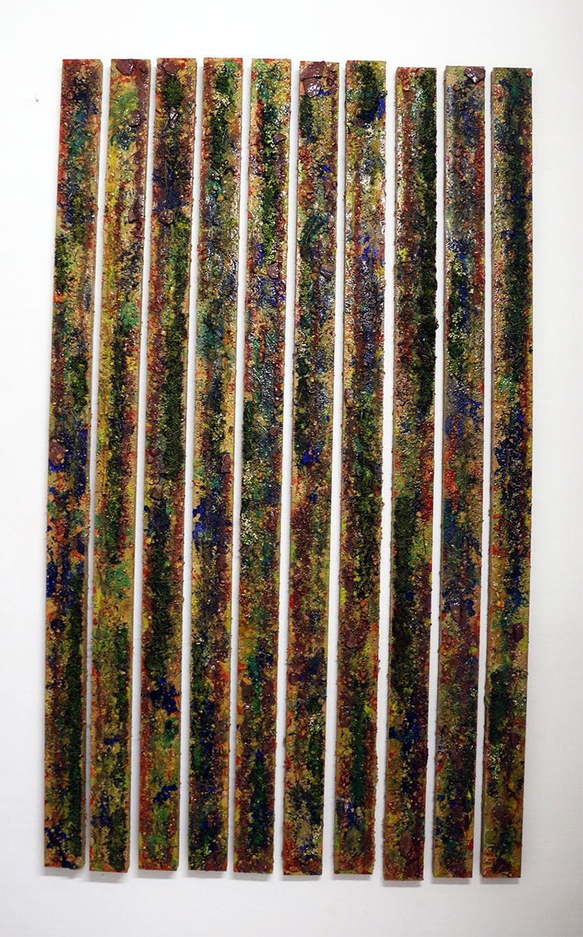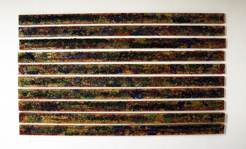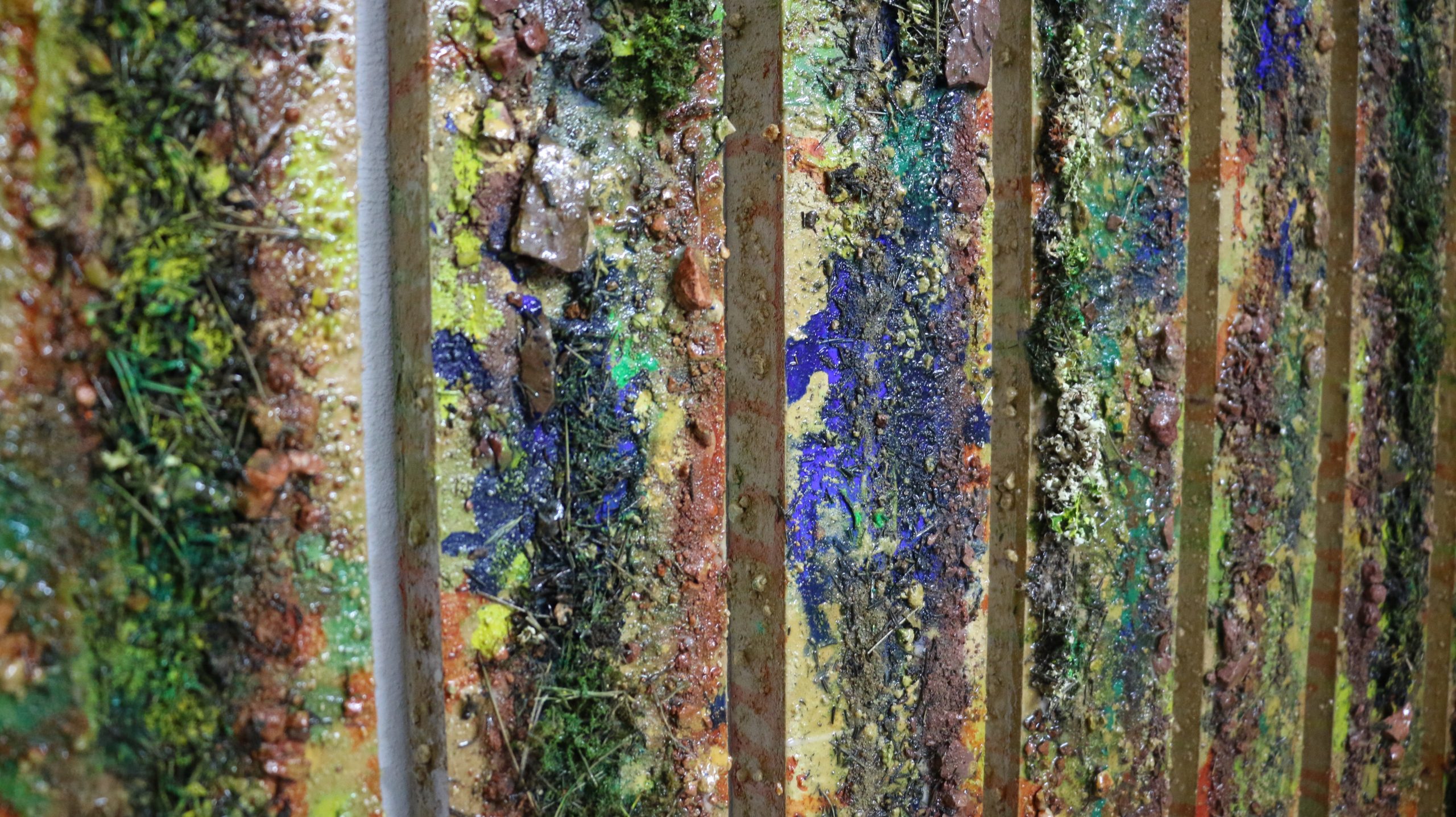 Cada lámina ha sido construida con materiales orgánicos recogidos directamente del entorno natural: tierra, piedras, pequeñas ramas… todos adheridos sobre soportes de madera de pino y sellados con capas de barniz y resina que refuerzan la composición y aportan brillo y protección.
