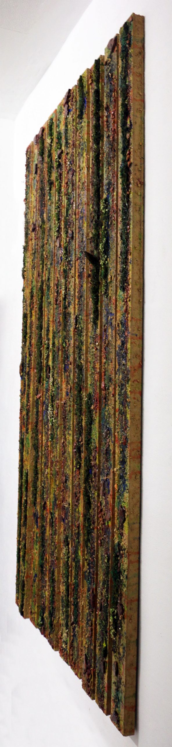 Técnica Mixta donde predominan los materiales procedentes de la naturaleza sobre soporte reciclado dm a doble cara.
