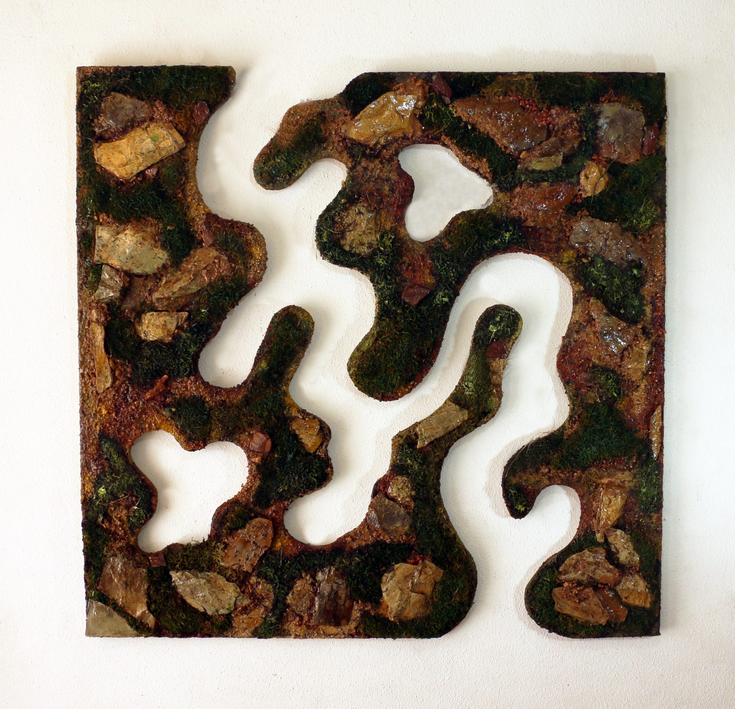 Plétora pertenece a la colección Bio-paisaje, una serie en la que exploro la fusión entre arte, naturaleza y experiencia humana. En esta obra recreo un paisaje natural dividido por un río, que actúa como línea de separación simbólica, marcando un antes y un después, un cambio, un tránsito. El paisaje ha sido construido con materiales orgánicos recogidos directamente del entorno natural: tierra, piedras, pequeñas ramas… todos adheridos sobre un soporte de madera de pino, y sellados con capas de barniz y resina que refuerzan la composición y aportan brillo y protección.
