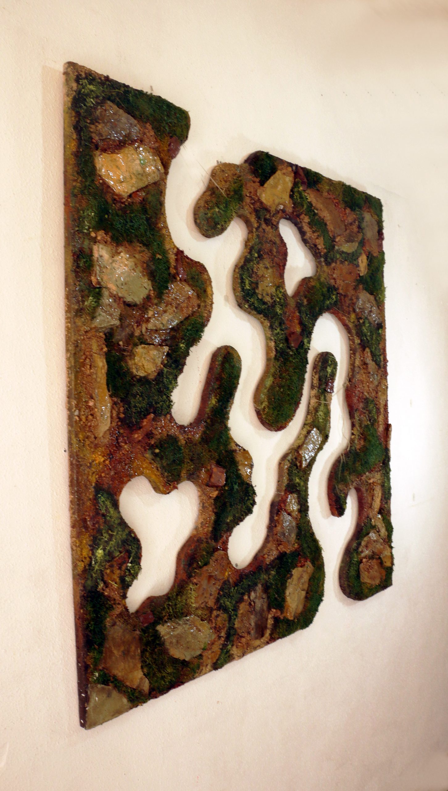 Técnica Mixta donde destacan los materiales procedentes de la naturaleza, sobre soporte de madera.